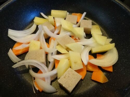 今日は超~簡単な「ランチ」をご紹介します♪ まず、フライパンに薄切りにした「人参」と「玉ねぎ」 小さめにカットした「ジャガイモ」に、一口大に切った「玄米餅」(普通のお餅でもOK♪)を敷きます♪ その上に適当な大きさに切った「キャベツ」に「シメジ…